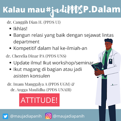 “Untuk jadi seorang internist, kamu ngga perlu pinter, yang penting punya tanggung jawab, karena dengan rasa tanggung jawab terhadap pasienmu maka ilmu itu akan kamu cari dengan sendirinya,” pesan dr. Angga. Selain itu, attitude juga menjadi salah satu poin yang penting. Karena pintar saja tidak cukup. Pembawaan diri yang baik, sopan dan hormat pada guru-guru adalah salah satu kunci sukses menjadi PPDS interna menurut dr. Imam.